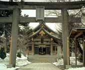 参道周辺はきちんと除雪されており、石畳なので濡れる心配もありません。石の鳥居をくぐり、階段を登ると社殿があります。階段の両脇に雪が山型に積み上げられていました。上賀茂神社(京都市北区)の立砂のようで格好いいなあと思い、側面から写真を撮ってみると、円錐というより単にうず高いだけの山で、あまり見栄えのするものではありませんでした。心意気は買います。